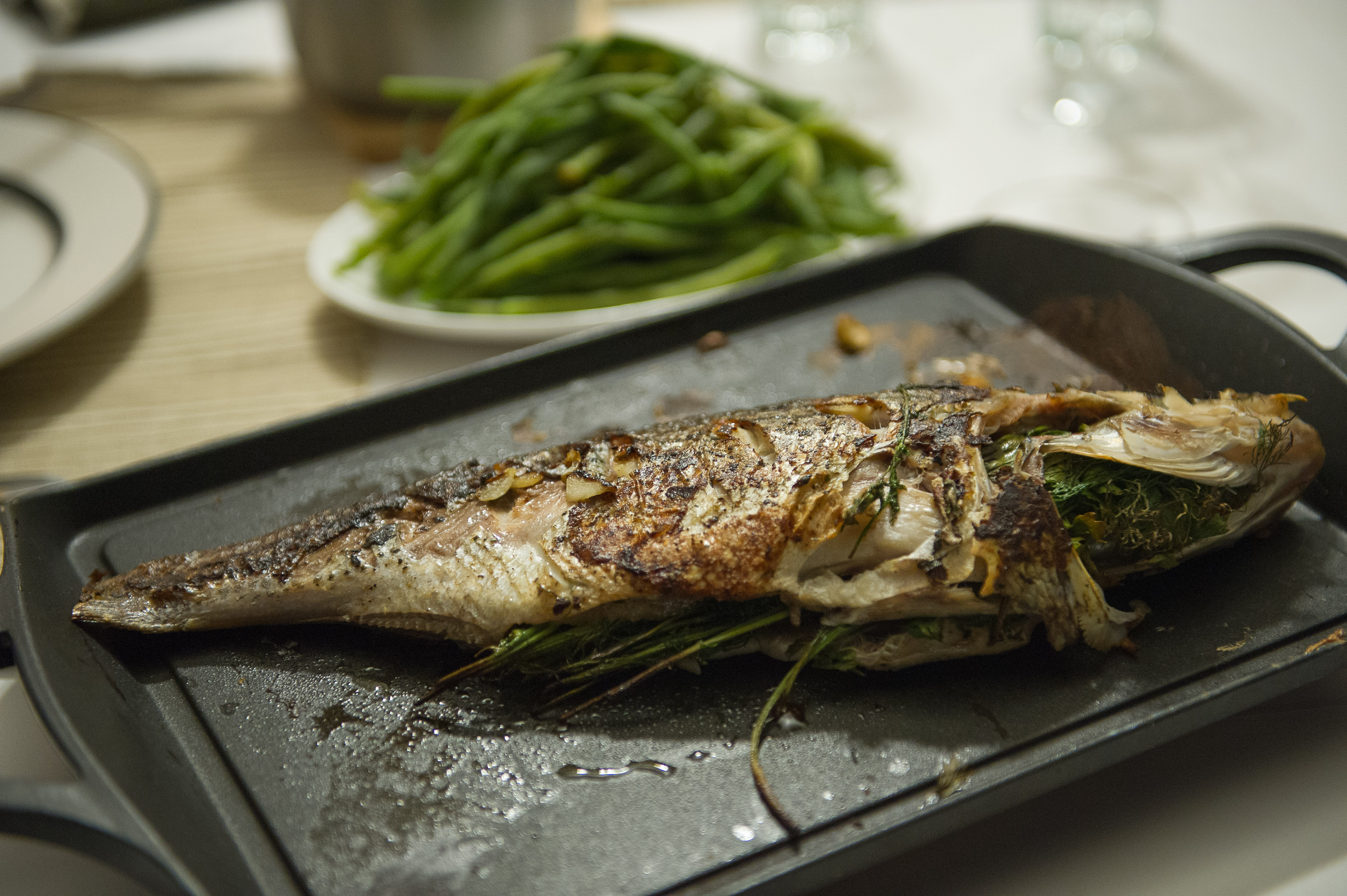 Dabar žuvį jau galima pašauti į orkaitę (180-200 C) arba kišti į grilį su dangčiu. Jei žuvis sausa, galite pašlakstyti aliejumi, tačiau jei ketinate kepti doradas, jūros ešerius, lašišą ar kokią kitą jūrinę žuvį, aliejaus nereikia – užteks pačios žuvies turimų riebalų.
